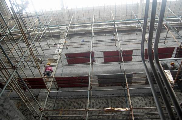京溪污水工程系全地下施工,土建還有許多工作要同時做,拆摸、拆支撐架、拆臨時混凝土柱、砌墻、裝飾等,安裝在此交叉施工環(huán)境中進行,噪音、灰塵、潮濕、陰暗、悶熱、不通風、空間狹小。同時,交叉點多,安全要求高。只要有一個工作面,除了我們和土建,還有其他單位人員也要同時進行,消防、照明、通風、起重等,兩層地下室,每一層8-10米高,還有小型運料車輛進入。里面全是人,腳手架、孔洞,安全要求太大。而且,材料、設(shè)備搬運、吊裝困難。只有一個進出口,大的設(shè)備、材料要從吊裝口吊入,再通過自己因勢利導(dǎo)想的現(xiàn)場辦法才能運、移、吊裝到位。在里面吊車不能進,柱、梁也多,全靠人。有時一臺設(shè)備吊進去搬運安裝到位得要2天。