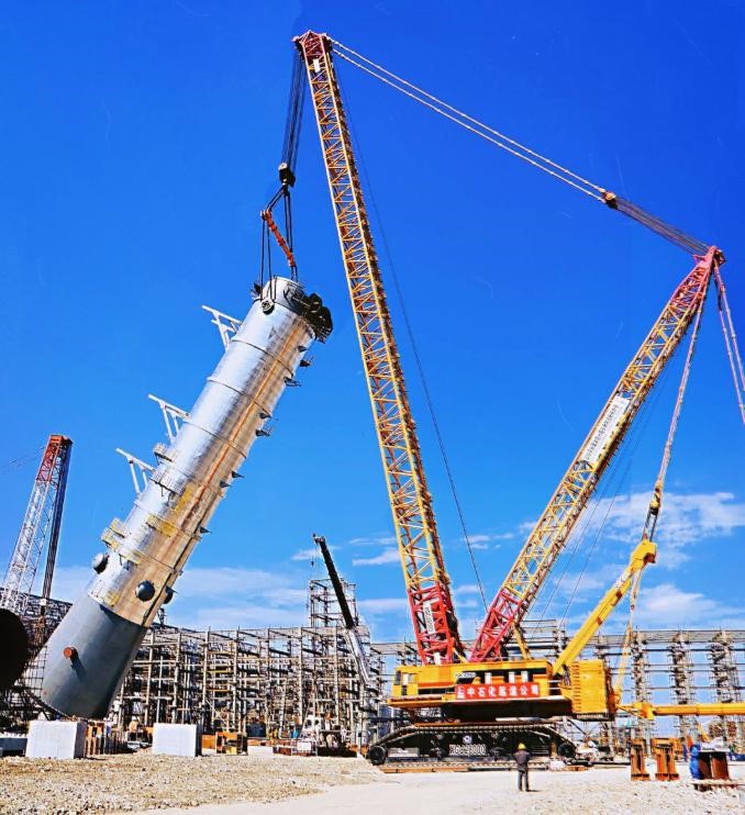 自今年9月20日以來, 苯乙烯項(xiàng)目部共成功吊裝第一脫氫換熱器、三聯(lián)換熱器、轉(zhuǎn)烷基化反應(yīng)器、苯處理器、多乙苯塔、苯/甲苯塔等大型設(shè)備13臺(tái),吊裝總噸位約達(dá)2000噸。其中,最重設(shè)備三聯(lián)換熱器重687噸,高41米,最大吊裝高度63米;而這次吊裝的低壓粗苯乙烯塔,塔體總高度92.2米,重量950噸,是整個(gè)大型設(shè)備吊裝中最復(fù)雜的設(shè)備之一,分兩段運(yùn)至施工現(xiàn)場(chǎng),由2000噸吊車吊起來空中組對(duì)、焊接。