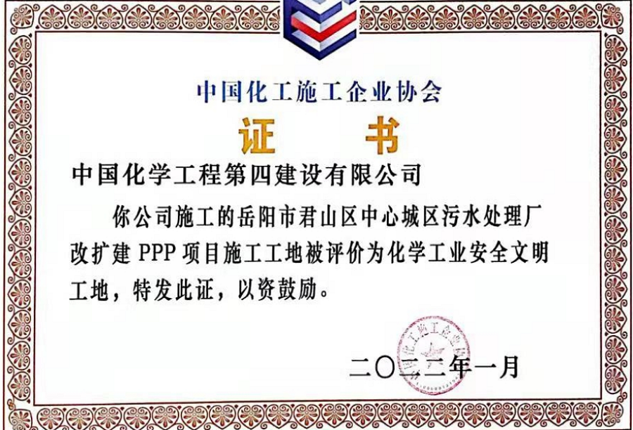 近日,從中國化工施工企業協會傳來喜訊,由市政工程公司承建的岳陽市君山區中心城區污水處理廠改擴建PPP項目被評為“化學工業安全文明工地”稱號。