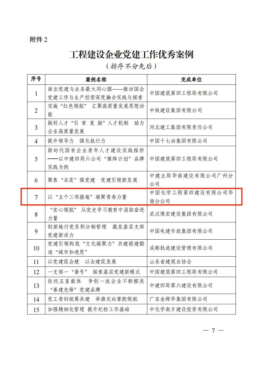 近日,從中國施工企業管理協會傳來喜訊,華南公司黨建工作案例《以“五個三項措施”凝聚青春力量》和中南公司黨建工作案例《黨建引領“三三制”培根鑄魂促發展》獲評2022年度“工程建設企業黨建工作優秀案例”。