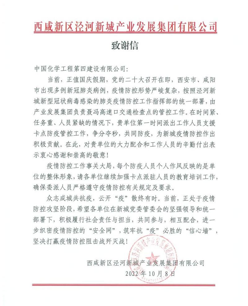 10月9日,陜西西咸新區(qū)涇河新城產(chǎn)業(yè)發(fā)展集團(tuán)有限公司向公司發(fā)來(lái)了致謝信,信中對(duì)西部公司泊灣中心項(xiàng)目部在國(guó)慶假期、二十大召開(kāi)前夕抽調(diào)人員支援西安市聶馮高速口防疫檢查的工作表示衷心感謝,對(duì)公司以實(shí)際行動(dòng)助力屬地疫情防控工作給予高度贊揚(yáng)。