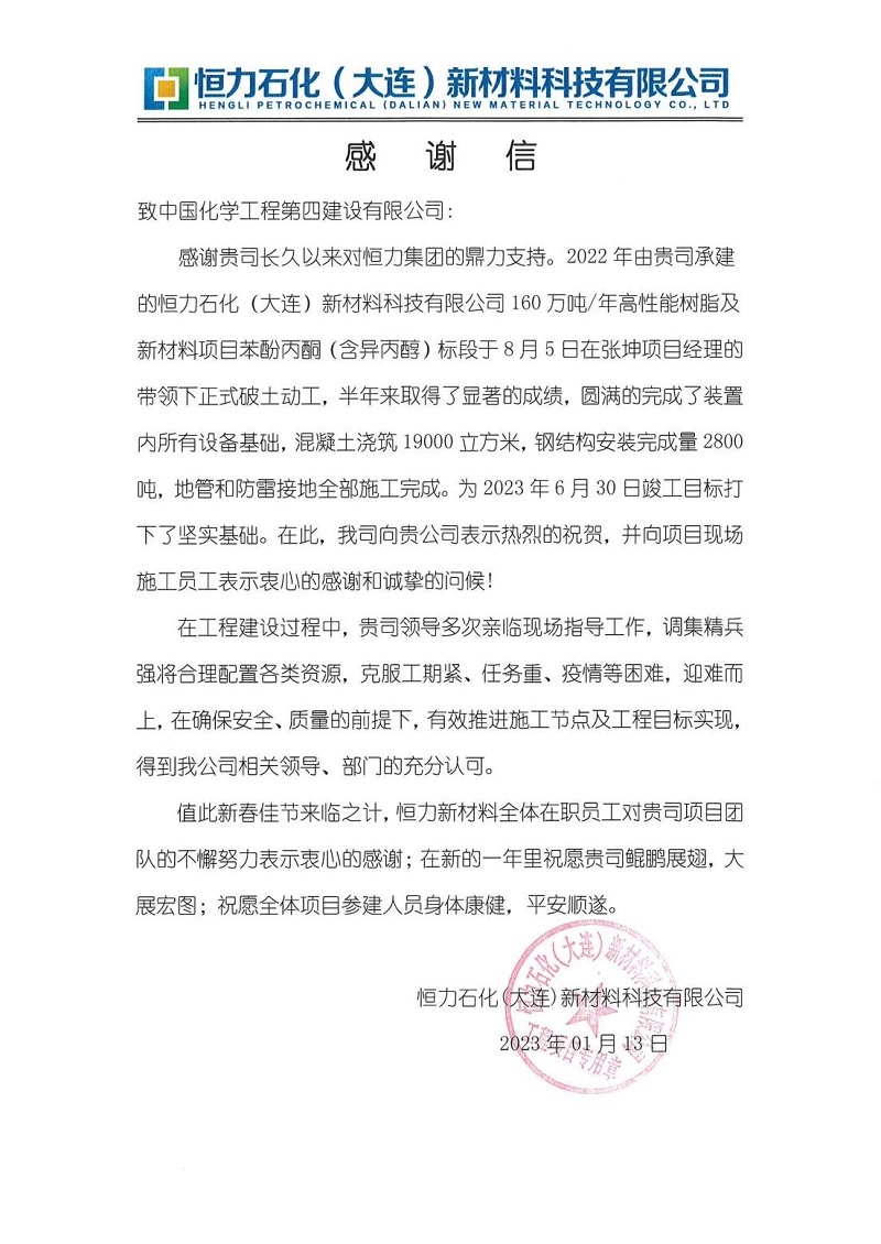 近日,東北公司收到恒力石化(大連)新材料科技有限公司發(fā)來的感謝信,對東北公司承建的苯酚丙酮裝置工作給予高度肯定,并對項(xiàng)目現(xiàn)場施工員工的辛勤付出表示感謝。
