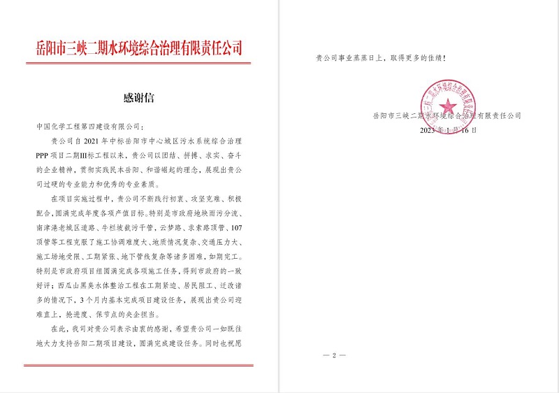 1月16日,岳陽市中心城區(qū)污水系統(tǒng)綜合治理項(xiàng)目部收到岳陽市三峽二期水環(huán)境綜合治理有限責(zé)任公司發(fā)來的感謝信。
