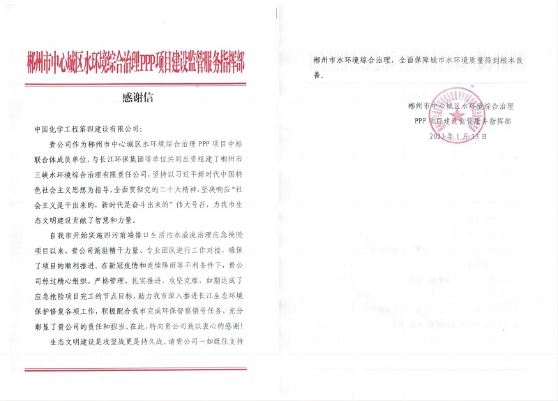 新年伊始,公司郴州項(xiàng)目部收到郴州市中心城區(qū)水環(huán)境綜合治理PPP項(xiàng)目建設(shè)監(jiān)管服務(wù)指揮部發(fā)來感謝信。