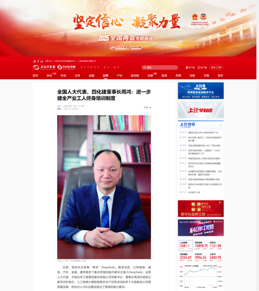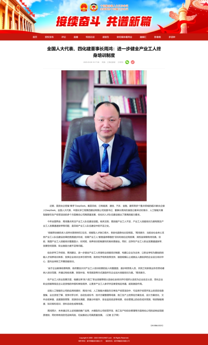 2025年全國(guó)兩會(huì)期間,全國(guó)人大代表,中國(guó)化學(xué)四化建黨委書記、董事長(zhǎng)周鴻向大會(huì)提交《關(guān)于加強(qiáng)產(chǎn)業(yè)工人隊(duì)伍建設(shè)的建議》《關(guān)于多措并舉解決拖欠建筑施工企業(yè)工程款的建議》《關(guān)于推動(dòng)洞庭湖區(qū)常岳九鐵路、荊岳鐵路、監(jiān)利至華容至益陽鐵路規(guī)劃建設(shè)提速的建議》《關(guān)于修改最高法院〈關(guān)于大型企業(yè)與中小企業(yè)約定以第三方支付款項(xiàng)為付款前提條款效力問題的批復(fù)〉的建議》等4條建議,受到主流媒體深入報(bào)道,引起社會(huì)各界廣泛關(guān)注。