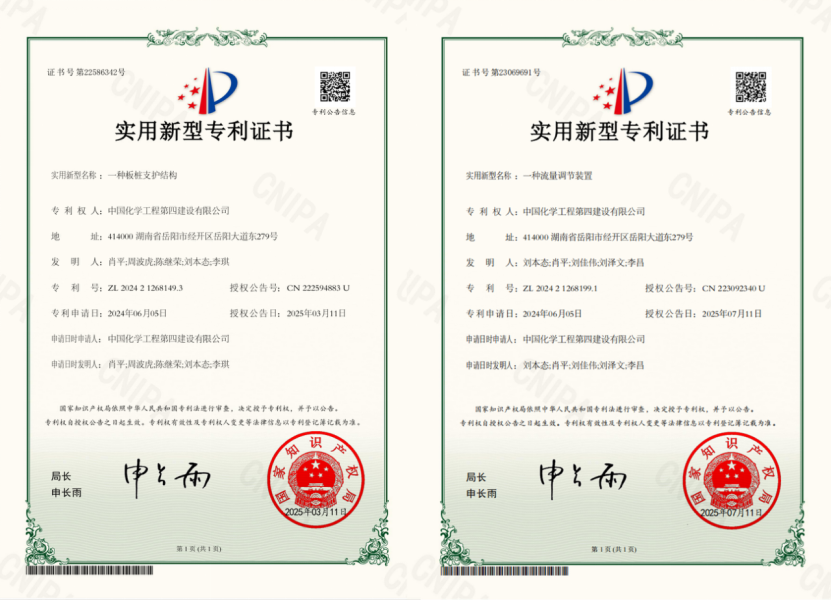 近日,西部公司技術創(chuàng)新喜結碩果,自主研發(fā)的“一種板樁支護結構”“一種流量調節(jié)裝置”兩項技術分別獲國家知識產權局實用新型專利授權。