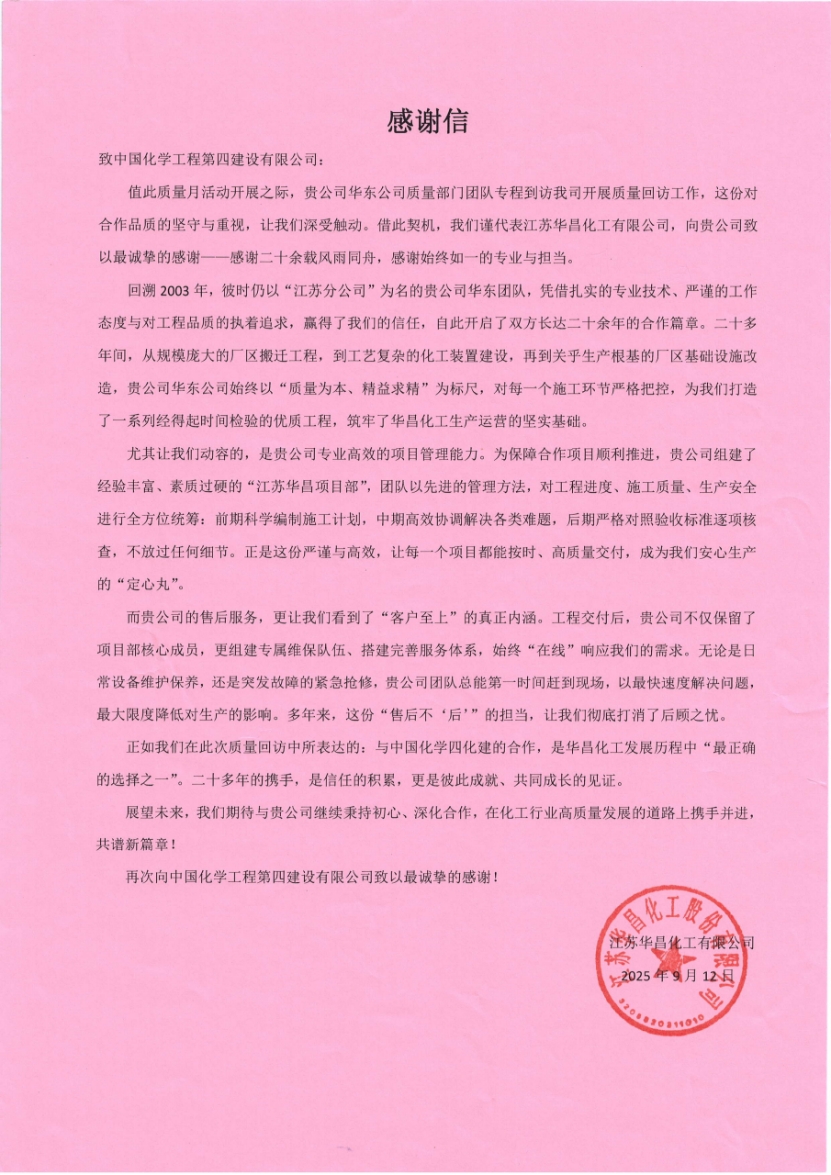 近日,在全國(guó)“質(zhì)量月”活動(dòng)開展之際,華東公司收到江蘇華昌化工有限公司發(fā)來的感謝信。這份滿載認(rèn)可的信函,不僅是合作方對(duì)華東公司質(zhì)量管理工作的高度肯定,更成為雙方20余載風(fēng)雨同舟、攜手共進(jìn)的深厚合作情誼的生動(dòng)見證。