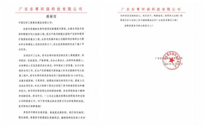 近日,華南公司收到廣東東粵環(huán)保科技有限公司發(fā)來感謝信,對項目部提前3天完成新增蒸汽管線、分離車間技術(shù)改造和脫碳車間大檢修工程表示誠摯感謝。
