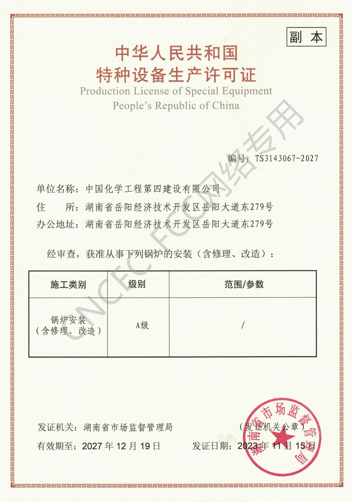 A級鍋爐安裝、修理、改造許可證
